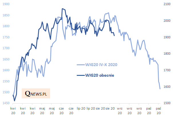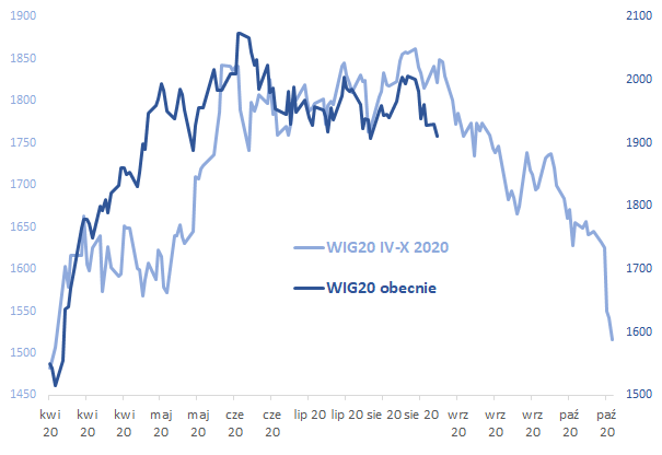 Analiza wykresu WIG20 nasuwać może pewne analogie z początkiem września ub.r., gdy indeks również był w okolicach kilkumiesięcznego minimum, po czym przebił poziom wsparcia i w ciągu dwóch kolejnych miesięcy mocno zanurkował.
