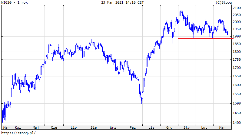 WIG20 już od stycznia jest w trendzie bocznym, balansując na poziomie wsparcia w okolicy 1900 pkt.