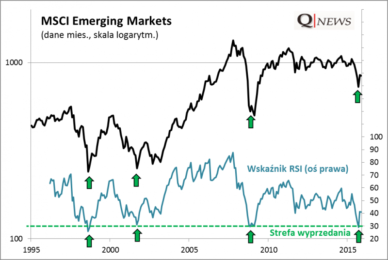 We wrześniu/październiku zwracaliśmy uwagę (np. tu), że akcje na rynkach wschodzących osiągnęły stan silnego "wyprzedania", mierzonego według popularnego wskaźnika RSI (tyle że liczonego na podstawie danych miesięcznych, a nie dziennych tak jak to się zwykle robi). Taka sytuacja historycznie zdarzyła się tylko kilka razy.