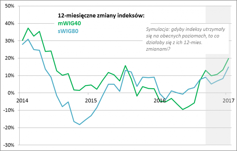 Pocieszające jest to, że być może za sprawą opisanych sprzeczności na GPW nie widać żadnych typowych oznak niebezpiecznego optymizmu (o euforii już nie wspominając). W sondażu Stowarzyszenia Inwestorów Indywidualnych odsetek byków (optymistów) spadł właśnie poniżej odsetka niedźwiedzi. W danych o napływach do funduszy inwestycyjnych też próżno szukać euforycznych zakupów produktów akcyjnych - pieniądze w tym roku płynęły do tej pory głównie do funduszy obligacji. Jeśli nie dojdzie do jakiegoś gwałtownego załamania trendu zwyżkowego na rynku małych i średnich spółek, być może to zacznie się jednak zmieniać. Jeśli przyjąć założenie, że napływy do funduszy podążają w ślad za 12-miesięcznymi stopami zwrotu, to warto zwrócić uwagę, że wrzesień jest pierwszym od dawna miesiącem, w którym 12-miesięczna zmiana mWIG wchodzi już na poziomy dwucyfrowe (w przypadku sWIG też niewiele do tego brakuje). Aż do stycznia pozytywnie na roczne stopy zwrotu będzie oddziaływał efekt bazy.