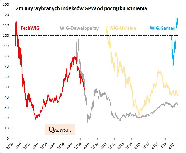 GPW nie miała też szczęścia z niektórymi innymi indeksami, których wprowadzenie było wyrazem aktualnie panującej mody. Benchmark WIG-deweloperzy (później przemianowany na WIG-nieruchomości) urodził się na szczycie mody na tę branżę, a potem dokładnie jak TechWIG poniósł dotkliwe straty. Podobny los spotkał też powołany w 2011 roku WIG-Ukraine. Póki co najlepiej z tego zestawu wypada uruchomiony w zeszłym roku WIG.Games, który początkowo stracił "jedynie" 30% i od tego czasu z nawiązką odrobił straty.