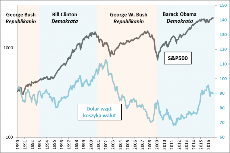 Demokraci lepsi dla giełdy i dolara?![]() Nadchodzące wybory to okazja do swoistej zabawy historią. Ciekawostką samą w sobie jest fakt, że każdy z ostatnich trzech prezydentów USA urzędował przez dwie kolejne kadencje. Jednocześnie po odejściu ze stanowiska reprezentanta danej partii jego miejsce zajmował kandydat partii opozycyjnej. Gdyby trzymać się tej drugiej zależności, to należałoby oczekiwać, że na fali „znużenia” ośmioletnimi rządami Demokratów teraz zatriumfują dla odmiany Republikanie. I jeszcze jedna ciekawostka – na przestrzeni ostatniego ćwierć wieku zarówno amerykańskie akcje, jak i dolar sprawowały się dużo lepiej w trakcie kadencji prezydentów o … demokratycznym rodowodzie. Z drugiej strony, to właśnie za czasów Billa Clintona została napompowana tzw. bańka internetowa, której pęknięcie przyniosło bolesne skutki dla gospodarki już za czasów Republikanina Georga W. Busha. Niektórzy twierdzą, że podobna bańka spekulacyjna na rynku akcji powstała też w trakcie II kadencji B. Obamy, a jej skutki będą widoczne dopiero po upływie czasu. |