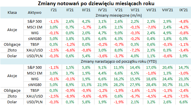 Reasumując, wrzesień nie zburzył całościowego obrazu pierwszych trzech kwartałów tego roku, na który składają się świetne stopy zwrotu z akcji, a jednocześnie słaba postawa hurtowych obligacji skarbowych i złota.