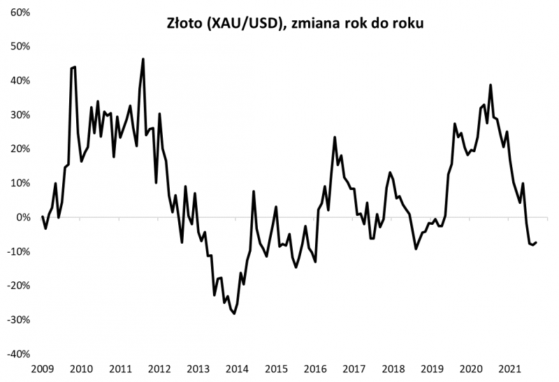 Rys. 3. 12-miesięczna dynamika cen złota przekręciła się z silnie dodatniej na umiarkowanie ujemną