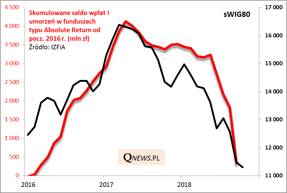 Jeśli spojrzymy na bardziej długoterminowy kontekst, to okaże się, że wrześniowa fala odkupów w funduszach absolute return przyniosła kulminację trendu trwającego już od maja 2017 roku. W całym tym okresie wg naszych obliczeń z tej kategorii funduszy uciekło netto prawie 3,8 mld zł gotówki. Oznacza to, że "skasowana" została już znakomita większość napływów z okresu największej mody na tę grupę funduszy (2016-wiosna 2017). Nie ma jednocześnie wątpliwości, że to właśnie ucieczka kapitałów była jednym z głównych źródeł podaży akcji małych i średnich spółek na GPW.