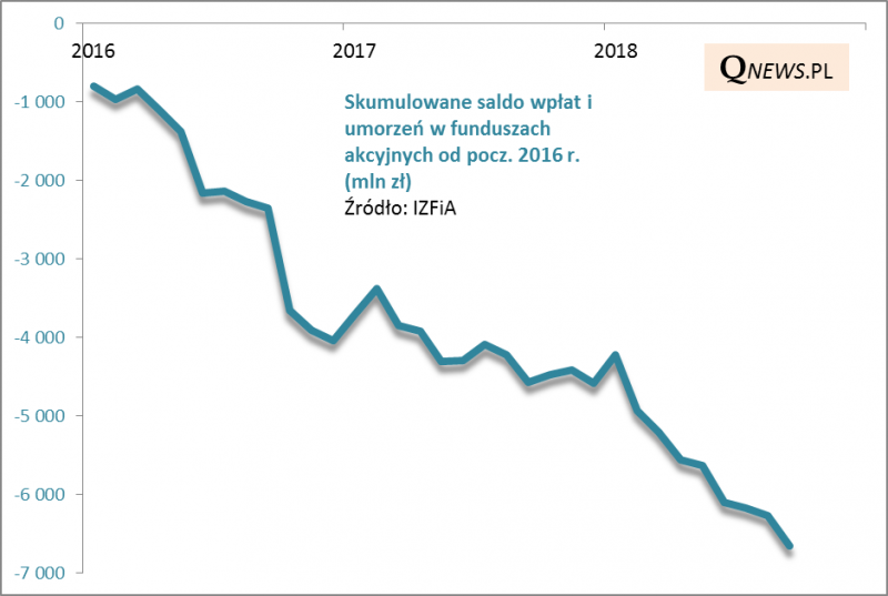 W tzw. międzyczasie już od prawie trzech lat mamy jednocześnie niemal nieprzerwany exodus kapitałów z funduszy typowo akcyjnych. Od początku 2016 roku uciekło z nich netto już prawie 7 mld zł.
