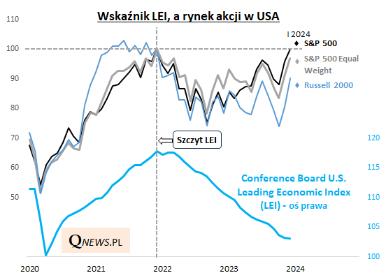 Jakiś czas temu narzekaliśmy też, że tym razem trend spadkowy LEI od pewnego momentu (a dokładniej - od drugiej połowy 2022) zaczął się nietypowo w porównaniu z historią "rozjeżdżać" względem odrabiającego straty indeksu S&P 500 (który notabene jest jednym z dziesięciu komponentów LEI, jako sam w sobie miewający właściwości wyprzedzające wobec gospodarki). Trzeba jednak też przyznać, że trend spadkowy LEI nie pozostawał bez jakiegokolwiek negatywnego wpływu na Wall Street. Widać to najlepiej, jeśli na rynek akcji spojrzymy szerzej, czyli na indeksy takie, jak wersja S&P 500 o równych wagach (Equal Weight), czyli niezdominowana przez technologiczne giganty, czy też gromadzący liczne małe spółki Russell 2000.