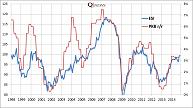 Kiedy w przeszłości ESI spadał do wielomiesięcznego minimum po wcześniejszym długotrwałym wzroście, był to poważny sygnał ostrzegawczy dla inwestorów giełdowych (2007, 2011). Na szczęście obecnie nie mamy do czynienia z taką sytuacją. Co prawda we wrześniu ESI postraszył na chwilę, ale zaraz potem wystrzelił na nowo w górę i znalazł się na poziomie najwyższym od ponad trzech lat. To może być sygnał, że także w trwającym IV kwartale dynamika PKB nie uległa większemu schłodzeniu. Podtrzymanie trendu wzrostowego ESI potencjalnie dobrze rokuje także na 2015 r.