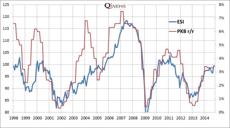 Dziś chcielibyśmy zwrócić uwagę na wskaźnik, który raczej umyka powszechnej uwadze, choć charakteryzuje się silną korelacją z (publikowanymi dużo później) danymi na temat PKB. Chodzi o obliczany przez Eurostat Economic Sentiment Indicator (ESI, dosł. „wskaźnik nastrojów ekonomicznych”). Jest on złożony z pięciu składników obrazujących poziom „zaufania” w przemyśle, usługach, wśród konsumentów, w budownictwie i handlu detalicznym. Wiedza na temat nastrojów czerpana jest z ankiet.