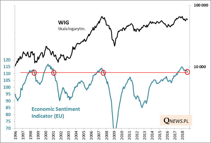 Na tym wykresie zarówno pesymiści, jak i optymiści znajdą coś dla siebie (tak to bywa z analizami makro...). "Niedźwiedzie" mogą argumentować, że ESI spada z bardzo wysokich pułapów, a w dwóch historycznych przypadkach (2001, 2008) podobne spadki zapowiadały głęboką zadyszkę w gospodarkach, która owocowała bessą na GPW. W takim scenariuszu trwający od stycznia spadek WIG-u byłby dopiero wstępem do dalszej potencjalnej przeceny.