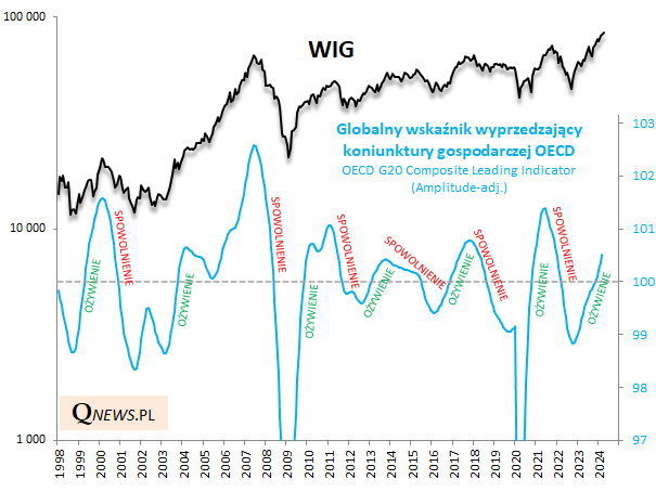 W najnowszych odczytach cenionych przez nas wskaźników wyprzedzających OECD (CLI) za marzec trudno byłoby dopatrzeć się jakichkolwiek negatywnych sygnałów dla hossy trwającej na polskim rynku akcji. Zbiorczy, globalny CLI nie tylko nie wykazuje żadnych oznak słabości, lecz nawet zaczął wyraźnie przyspieszać wspinaczkę (jego miesięczny wzrost wyniósł w marcu 0,153 pkt. - takiego tempa jeszcze nie było w trakcie fali zwyżkowej rozpoczętej na jesieni 2022). Najwyraźniej perspektywy dla gospodarek stają się coraz jaśniejsze, z czego korzystają indeksy giełdowe.