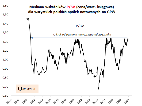 Może to być o tyle zastanawiające, że właśnie w tej okolicy dwukrotnie dochodziło już do zatrzymania hossy na GPW - ostatnio na przestrzeni 2021, a wcześniej w trakcie 2017 roku. Z drugiej strony, w przywołanym wyżej 2011 roku i wcześniej wskaźnik P/BV bywał jeszcze dużo wyżej niż obecnie.