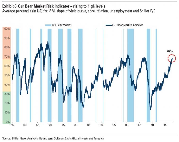 W ostatnim czasie zwracaliśmy uwagę na kwestie takie jak wysokie wyceny akcji w USA, niskie stopy bezrobocia w wielu gospodarkach czy też najwyższe od 2007 lub nawet 2000 roku rozmaite barometry koniunktury ekonomicznej. Okazuje się, że już jakiś czas temu zadania zagregowania tego typu wskaźników (jeśli chodzi o USA) podjęli się analitycy banku Goldman Sachs (GS). Pod uwagę biorą pięć komponentów: wskaźnik koniunktury gospodarczej ISM, nachylenie tzw. krzywej rentowności obligacji skarbowych, inflację bazową, stopę bezrobocia oraz wskaźnik P/E w wersji Shillera.
