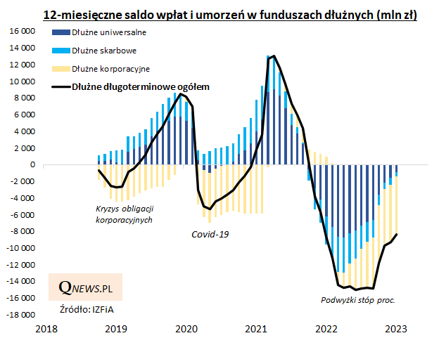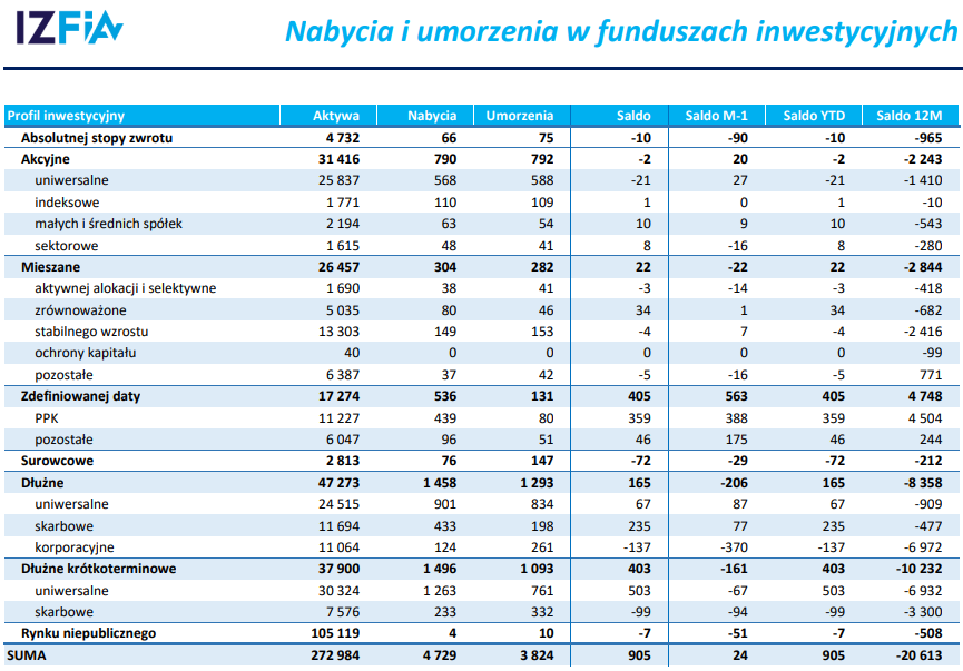 Chociaż w styczniu napływy do funduszy dłużnych przyćmiły inne kategorie funduszy, to jednak obserwujemy również oznaki poprawy w podmiotach inwestujących część (lub całość) środków w akcje. 12-miesięczne saldo wpłat i umorzeń w tzw. funduszach mieszanych poprawiło się czwarty raz z rzędu, co sugeruje, że mamy do czynienia ze zmianą tendencji (wcześniej negatywnej przez niemal cały 2022 rok). Pierwszy sygnał poprawy odnotowaliśmy też w funduszach czysto akcyjnych, gdzie 12-miesięczne saldo drgnęło w górę, po raz pierwszy od ... grudnia 2021.