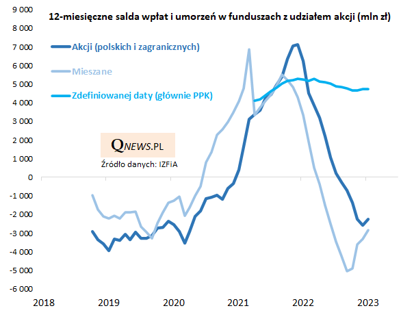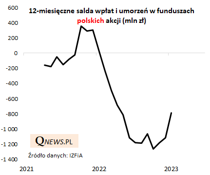 Zmianę tendencji jeszcze bardziej widać, jeśli z danych wyłowimy tylko fundusze polskich akcji. W ich przypadku 12-miesięczne saldo podskoczyło do poziomu najwyższego od dziewięciu miesięcy.