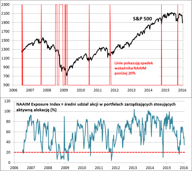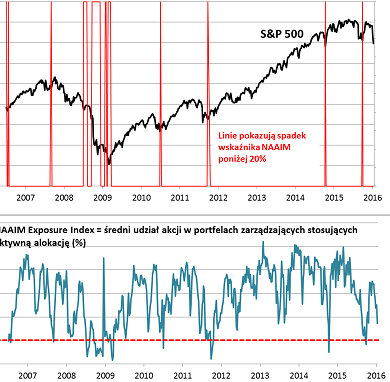 Jak pod tym względem wygląda obecna sytuacja? Pod lupę weźmy przykładowo sprawdzony, aczkolwiek mało znany wskaźnik obrazujący działania funduszy/firm zarządzających stosujących tzw. aktywną alokację (w zależności od sytuacji mogących szybko zmieniać udział akcji w portfelu). Ich zapatrywania bada sondażowo stowarzyszenie NAAIM.
