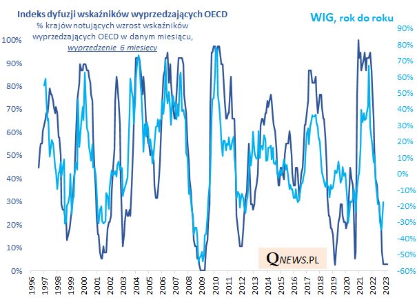 Nie kryjemy pewnego rozczarowania w tym miejscu, bo w poprzednim miesiącu indeks dyfuzji dawał pierwsze sygnały możliwego odbicia od dna, ale tym razem dane zostały na tyle mocno zrewidowane przez OECD, że wyczekiwane odbicie zniknęło. Na razie widać tu stabilizację blisko zera.