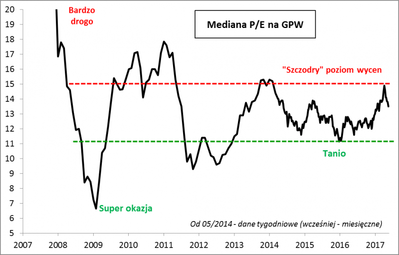 Na początku maja było dość drogo z historycznego punktu widzenia (aczkolwiek nie bardzo drogo - do bańki spekulacyjnej z 2007 roku bardzo daleka droga). A teraz? Drogo już nie jest - i to jest dobra wiadomość. Oczywiście o okazyjnych poziomach też trudno mówić, bo za okazję uznać można było historycznie P/E rzędu 11 lub jeszcze niżej. Ani drogo, ani tanio - czyli ... rozsądnie.