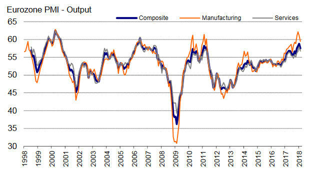 Wskaźniki PMI powstają na podstawie ankiet wśród kilku tys. europejskich firm. Eurozone Manufacturing PMI Output Index - obrazuje odpowiedzi na pytanie "czy produkcja twojej firmy jest większa niż w poprzednim miesiącu?"; Eurozone Services PMI Activity Index - "czy poziom aktywności w twojej firmie usługowej jest wyższy, niż w poprz. miesiącu?"; Eurozone PMI Composite Output Index = średnia ważona z Manufacturing i Services.