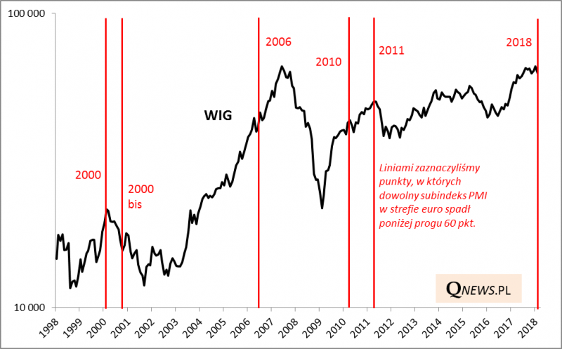 Biorąc poprawkę na fakt, że historycznie komentarze ekonomistów były z reguły uspokajające/bagatelizujące w podobnych sytuacjach, sprawdźmy co takie sygnały oznaczały dla polskiego WIG-u (co prawda omawiane tu odczyty dotyczą strefy euro, ale wzięcie pod uwagę WIG-u jest uzasadnione silnymi powiązaniami handlowymi).
