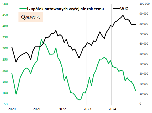 Analogicznie, w trakcie ubiegłego roku w górę podnosiła się liczba spółek notowanych niżej niż 12 miesięcy wcześniej. Na koniec 2024 takich walorów, które straciły na wartości, było 238. Oznacza to, że spółek, które w ubiegłym roku straciły na wartości było ponad dwa razy więcej niż tych, które zyskały.