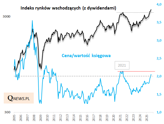Trzeba jednocześnie przyznać, że hossa na rynkach wschodzących w pewnym stopniu okupiona jest podnoszeniem się wskaźników wyceny. Przykładowo, współczynnik ceny do wartości księgowej (P/BV) przekroczył właśnie "okrągły" pułap 2,0. Kolejny cel to lokalny szczyt z 2021 roku - wtedy wskaźnik doszedł do 2,13.
