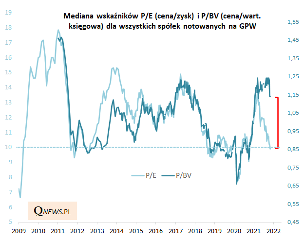 Z jednej strony wskaźnik P/E, którego mediana na GPW zawędrowała właśnie poniżej progu 10,0 po raz pierwszy od jesieni 2020, sygnalizuje, że na polskim rynku akcji jest znów dość tanio (choć oczywiście nie ekstremalnie tanio, bo w trakcie pandemicznego krachu P/E zanurkował poniżej 8,0).