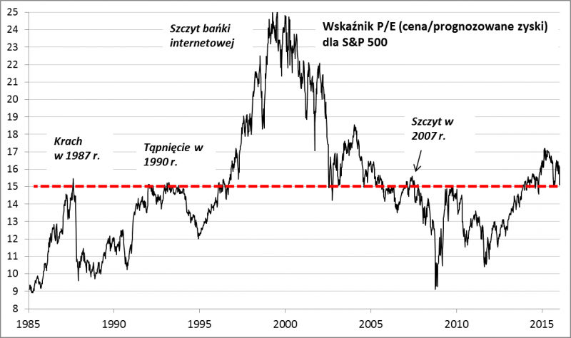 Jak te techniczne rozważania wyglądają w kontekście wycen akcji? Dobra wiadomość jest taka, że o ile niemal rok temu akcje z S&P 500 wyceniane były na aż 17-krotność prognozowanych zysków spółek, to po ostatnich turbulencjach jest to niespełna 15-krotność. Taki poziom jest już spójny z często cytowaną długoterminową średnią (dysponujemy danymi sięgającymi 1985 roku). Można tu mieć jednak takie zastrzeżenie, że owa średnia została mocno zawyżona w finałowym etapie tzw. bańki internetowej pod koniec lat 90. W okresach poza tą bańką i pierwszymi latami po jej pęknięciu poziom P/E = 15 był nie tyle normą, co raczej górną granicą wahań. Stwierdzenie, że akcje w USA po ostatnich turbulencjach są już tanie, byłoby więc dalekie od stanu faktycznego.