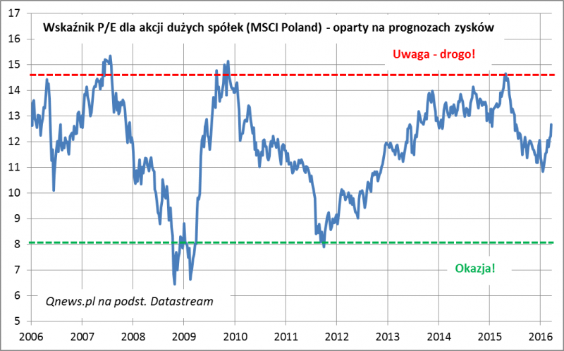 Każda dynamiczna fala wzrostowa ma swoją cenę. Tą ceną jest zwykle wzrost wskaźników wyceny. Nie inaczej jest i tym razem. Wskaźnik P/E oparty na prognozach zysków dużych spółek notowanych na GPW przebył drogę z okolic 11,0 do niemal 13,0.