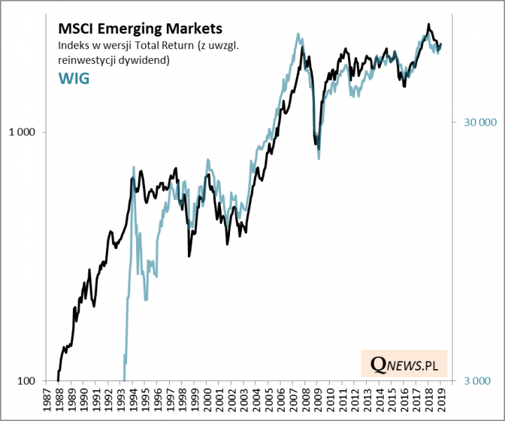 Ubiegły rok przyniósł indeksowi rynków wschodzących silny spadek z poziomu rekordu wszech czasów (w przypadku wersji indeksu uwzględniającego dywidendy). Nie przez przypadek o rekord otarł się przed ubiegłorocznym spadkiem również nasz WIG, który na dłuższą metę jest kopią indeksu emerging markets.
