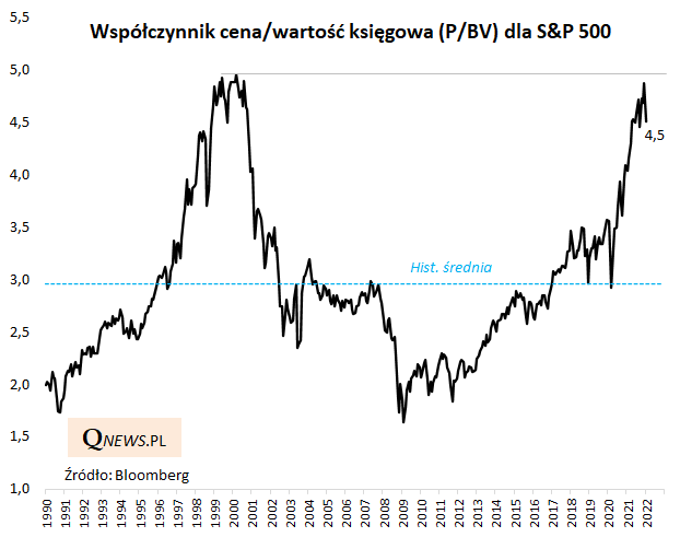 Jeśli wziąć pod uwagę uznawany za nieco staromodny współczynnik ceny do wartości księgowej, akcje na Wall Street przed nadejściem przeceny faktycznie były bardzo drogie - wskaźnik ocierał się już o szczyty z czasów tzw. bańki internetowej z przełomu wieków. Ostatnio spadł, ale ciągle jest jakieś 50% powyżej swej średniej historycznej. Zauważmy jak długą drogę przeszedł wcześniej od "Covidowego" dołka w marcu 2020 - wtedy był lekko poniżej owej średniej.