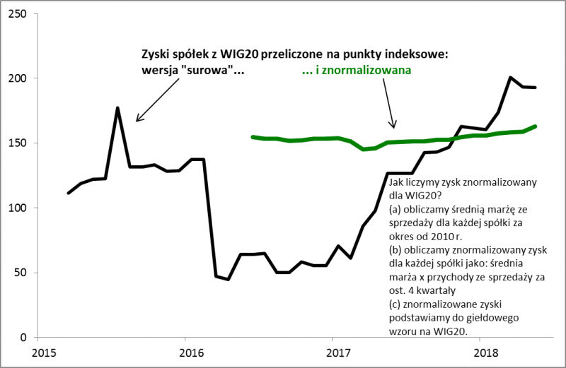 Ciekawostka jest taka, że o ile np. w połowie 2016 roku znormalizowany EPS był o wiele wyższy od zwykłego (pogrążonego wtedy m.in. przez wielomiliardowe odpisy w energetyce), to ostatnio mamy do czynienia z sytuacją odwrotną. Sugeruje to, że posługiwanie się zwykłym EPS dwa lata temu mogło dawać zdecydowanie zawyżone wartości wskaźnika cena/zysk (P/E), to teraz może dawać raczej zaniżone wartości.