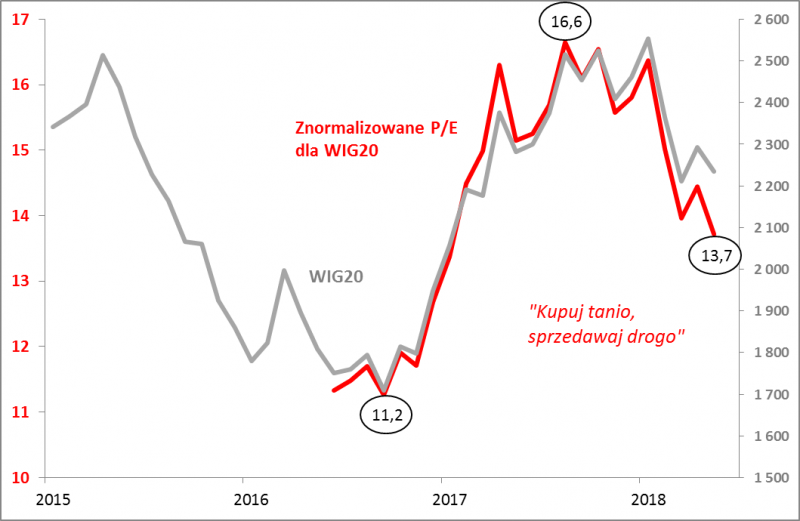 Próby liczenia wskaźnika cena/zysk (P/E) opartego na bieżących osiągnięciach blue chips dają – łagodnie mówiąc – wątpliwe rezultaty. Przykładowo gdybyśmy na początku 2016 roku – po prawie 30-proc. spadku WIG20 – obliczyli P/E na podstawie ówczesnych (bardzo kiepskich) wyników, to okazałoby się, że wskaźnik ten bujał w obłokach. A to z kolei byłoby niezbyt zgodne ze zdroworozsądkową intuicją – przecież po takim spadku akcje powinny mieć wskaźniki wyceny sporo niższe, a nie wyższe.