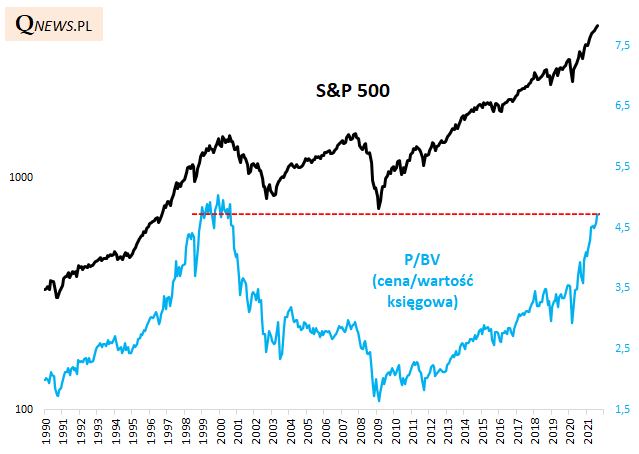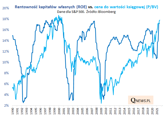 Po której stronie leży prawda? Zapewne gdzieś ... pośrodku. Z jednej strony najwyższy od lat poziom P/BV wpasowuje się w również niewidziany od dawna wyśrubowany poziom rentowności amerykańskich korporacji obrazowany przez współczynnik ROE (return on equity, rentowność kapitałów własnych, które są tym samym co wartość księgowa w przypadku P/BV). Innymi słowy, inwestorzy są gotowi dużo płacić za wartość księgową (kapitały własne) spółek, ale w zamian mogą cieszyć się, że owe spółki są aktualnie w stanie wygenerować z tych kapitałów własnych niezwykle wysokie zyski.