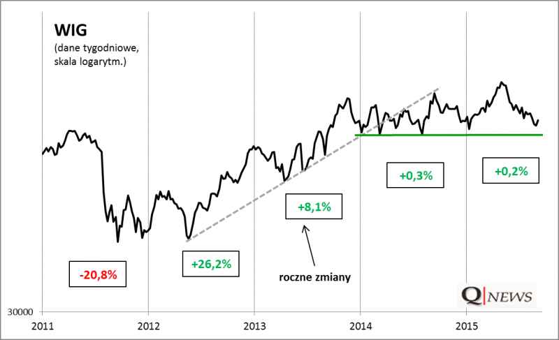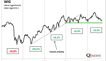 Od kilkunastu miesięcy WIG tkwi w trendzie bocznym. Ostatnia przecena przynajmniej na razie nie zmieniła tego stanu rzeczy. Szczególnie ważne, by nie pękł zaznaczony na zielono poziom wsparcia - wówczas trzeba by się zacząć zastanawiać czy przypadkiem trend boczny nie zamienia się na spadkowy. Jeśli to się nie stanie, to pozostanie druga opcja - ruch w górę w ramach trendu bocznego i może nawet sięgnięcie (przynajmniej na chwilę - tak jak w kwietniu) po nowy szczyt hossy?