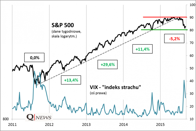 Na Wall Street, w odróżnieniu od naszego parkietu, linia trendu wzrostowego "pękła" dopiero dwa miesiące temu. Oczywiście przykład naszego WIG-u pokazuje, że przebicie linii to jeszcze nie to samo, co początek bessy. Dla S&P 500 kluczowym poziomem wsparcia jest teraz dołek z października ub.r. (1886 pkt. wg danych tygodniowych). Odnotowany niedawno wysoki poziom strachu wg indeksu VIX sugeruje, że ostatnie tąpnięcie mogło być raczej mocną korektą niż początkiem trendu spadkowego (bessy historycznie rozpoczynały się raczej w atmosferze wiary w hossę). Zauważmy, że rok 2011, w którym doszło do poprzedniego tak silnego wystrzału „indeksu strachu” (także poprzedzone półroczną „ciszą przed burzą”, czyli stagnacją notowań), ostatecznie zakończył się na Wall Street remisem.