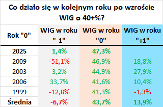 A teraz najważniejsze - co może czekać WIG w rozpoczynającym się 2026 roku? Jeśli historia jest tu w miarę trafną wskazówką, to należałoby oczekiwać, że stopa zwrotu w nowym roku będzie dużo bardziej umiarkowana, ale jednak ciągle raczej dodatnia niż ujemna. Średnia historyczna w zebranych poniżej przypadkach to +13,9 proc., a najsłabszy wynik to -1,3 proc.