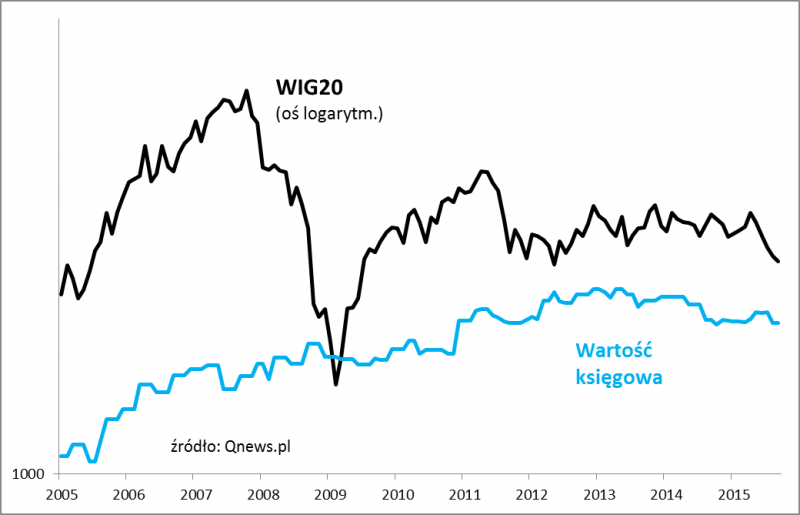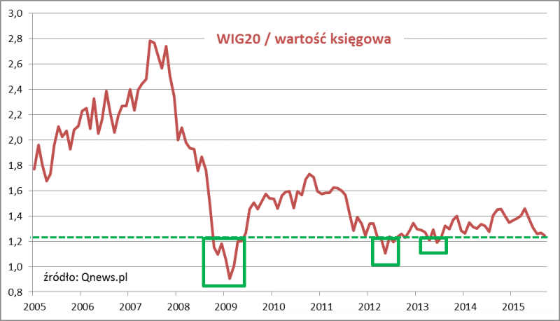 Już bez względu na to czy patrzymy na WIG20 czy WIG20TR, tak samo wygląda natomiast wykres wskaźnika cena/wartość księgowa.