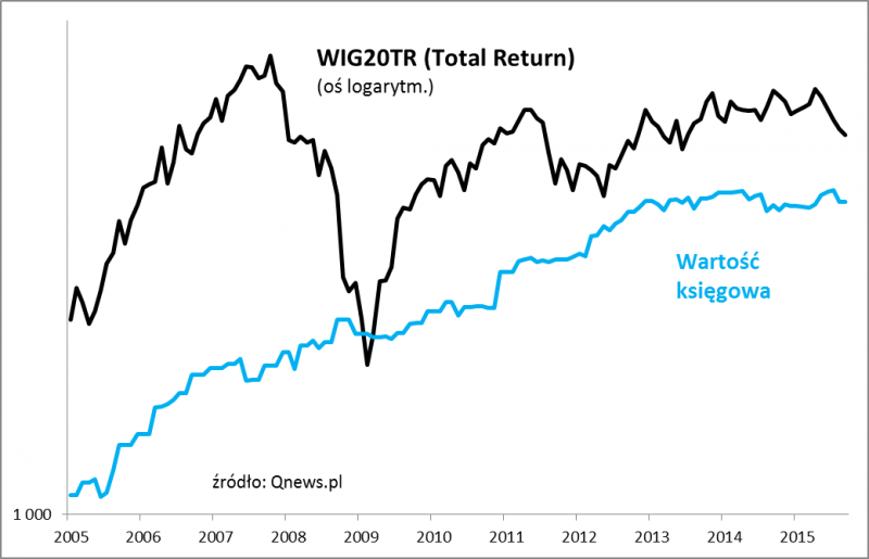 Uwagę zwraca fakt, że wartość księgowa od dwóch lat powoli dryfuje w dół. Częściowo jest to jednak bardziej efekt matematyczny niż rzeczywisty. Pamiętajmy, że w obliczaniu WIG20 nie są uwzględniane dywidendy (a te z kolei mogą obniżać wartość księgową). Być może lepiej więc spoglądać na tę wersję WIG20, która te dywidendy uwzględnia. Tutaj okazuje się, że wartość księgowa raczej stoi w miejscu niż spada.