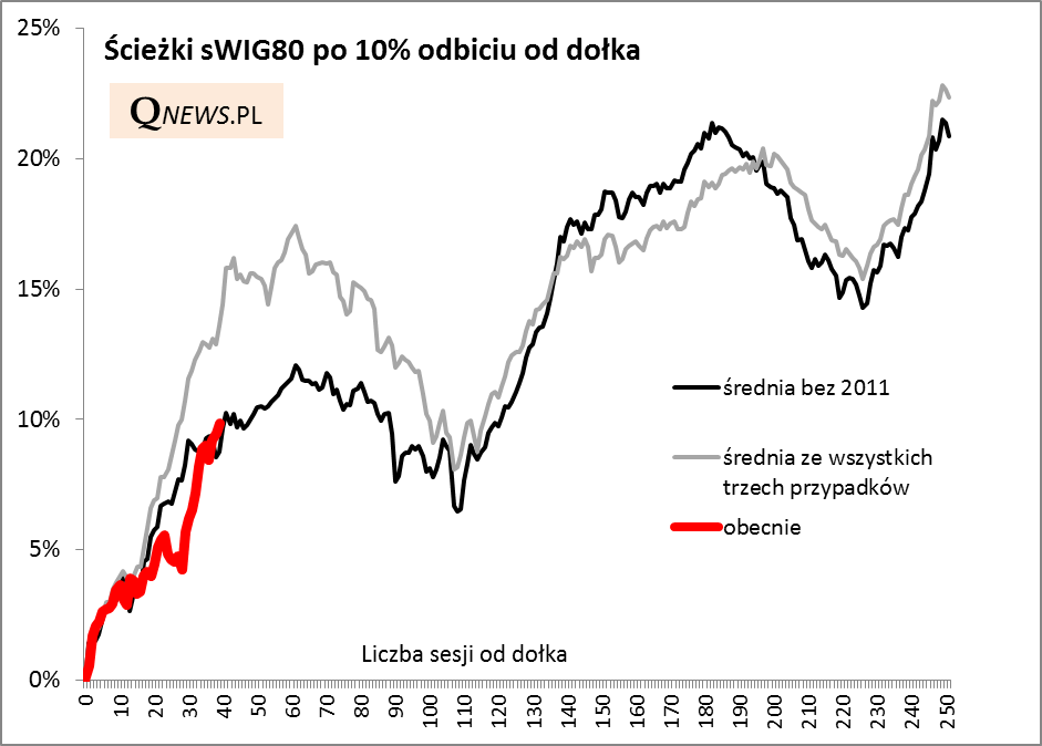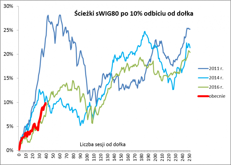 Ponad miesiąc temu zwracaliśmy uwagę, że indeks małych spółek sWIG80 podjął próbę "wyrwania się" z jednej z najdotkliwszych fal spadkowych po 2009 roku. Obecnie indeks jest już w zupełnie innym punkcie - urósł o niemal 10% od dołka.
