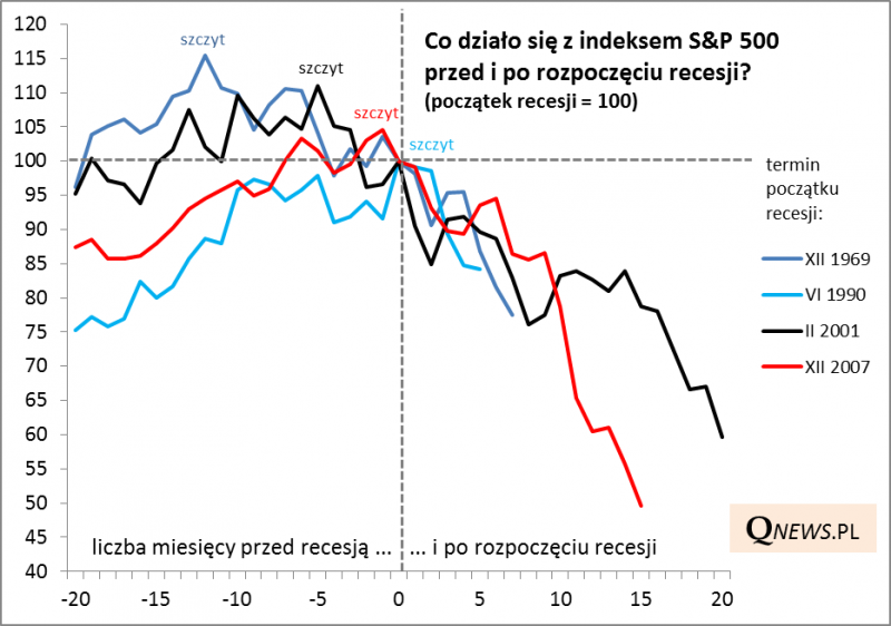 Zastanówmy się nad jeszcze jedną kwestią. Jak zachowywał się amerykański rynek akcji przed rozpoczęciem recesji? Pod uwagę wzięliśmy cztery przypadki z powojennej historii, w których okres boomu był najdłuższy.