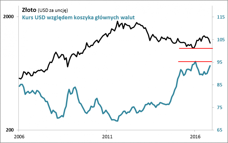 Najważniejszym czynnikiem decydującym o trendach na rynku szlachetnego metalu jest … dolar amerykański. Wystrzał notowań złota w I połowie roku tłumaczyć można było właśnie przede wszystkim osłabieniem USD względem innych walut. Na tej samej zasadzie ostatnia korekta spadkowa cen kruszcu to efekt głównie ponownego umocnienia USD, które przybrało na sile po wygranej D. Trumpa w wyborach prezydenckich. Zapowiedzi Trumpa odnośnie stymulacji fiskalnej (wydatki infrastrukturalne, cięcia podatków) zostały zinterpretowane jako sygnał, że potrzebne będą szybsze podwyżki stóp procentowych, niż wcześniej się spodziewano (lepsza koniunktura to perspektywa wyższej inflacji), a stąd już prosta droga do mocniejszego dolara. Zwłaszcza, że w innych krajach na podwyżki się nie zanosi.