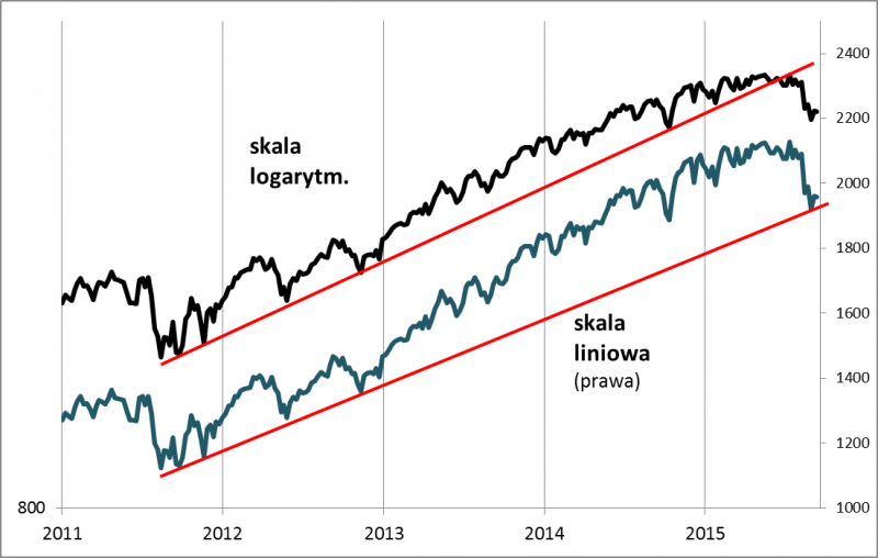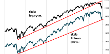 Fani analizy wykresów toczą odwieczny spór: czy wykresy powinny być w skali logarytmicznej czy zwykłej, liniowej? Na pozór to tylko niuans, ale obecnie urasta do rangi czynnika, który decyduje o ocenie sytuacji rynkowej. Jeśli bowiem spojrzymy na wykres S&P 500 w skali logarytmicznej, to otrzymujemy niezbyt ładny obraz: linia trendu wzrostowego wybiegająca z dołków z II poł. 2011 r. została przebita (czyli sytuacja uległa radykalnemu pogorszeniu). Tymczasem ten sam wykres, ale w tradycyjnej (liniowej) skali pokazuje, że ta sama linia nie została przebita. W dołku tąpnięcia S&P 500 jedynie zetknął się z nią.