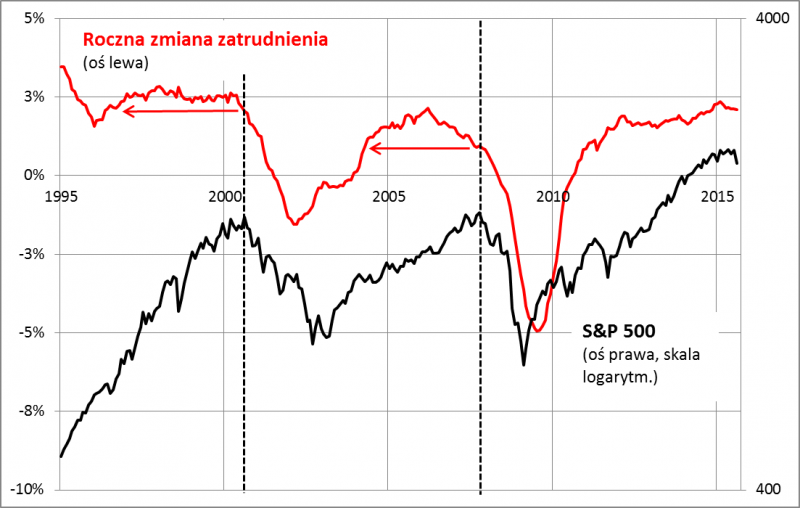 Co na to optymiści? Według naszych własnych badań sygnałem do ewakuacji z rynku akcji okazało się dwukrotnie załamanie rocznej zmiany zatrudnienia (uwaga komentatorów koncentruje się zwykle na miesięcznych zmianach, a te bywają chaotyczne). Kiedy wskaźnik ten schodził do poziomów najniższych od co najmniej kilkunastu miesięcy, S&P 500 właśnie przymierzał się do bessy (lata 2007 i 2000). Teraz z takim sygnałem jeszcze nie mamy do czynienia i jest mało prawdopodobne, by został wygenerowany w najbliższych miesiącach.