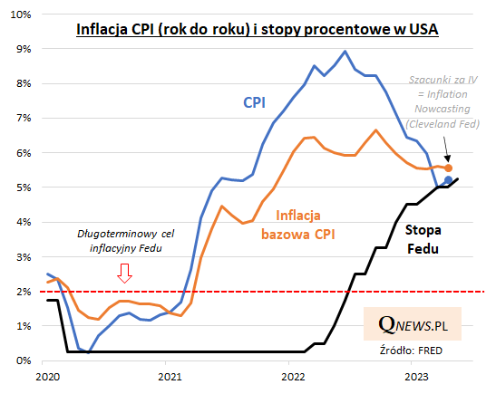 Jeśli wierzyć "szybkim" szacunkom (inflation nowcasting) modelu Cleveland Fed, inflacja CPI w kwietniu przestała się obniżać w ujęciu rok do roku. Przeszkodą w dalszej obniżce wydaje się uporczywa inflacja bazowa (core CPI, inflacja z pominięciem cen żywności i paliw).