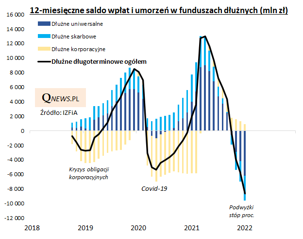 Przerwaniu dobrej passy w segmencie funduszy z udziałem akcji nie towarzyszy niestesty jak na razie odwrócenie niekorzystnego trendu w funduszach obligacji. W ich przypadku styczeń przyniósł dalsze pogłębienie odpływów netto, które w ostatnich 12 miesiącach wyniosły prawie 8,7 mld zł w przypadku pokazanych na poniższym wykresie funduszy dłużnych długoterminowych oraz dodatkowo ponad 3,7 mld zł w przypadku funduszy dłużnych krótkoterminowych.