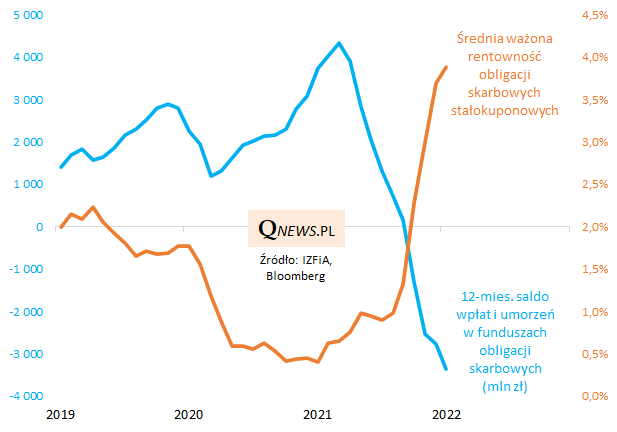 Cały czas podkreślamy natomiast, że rekordowy exodus kapitałów z funduszy dłużnych przyczynia się do wywindowania rentowności obligacji (w tym skarbowych jak na poniższym wykresie) do poziomów niewidzianych od lat. A to z czasem powinno zacząć działać na korzyść inwestycji w dług.