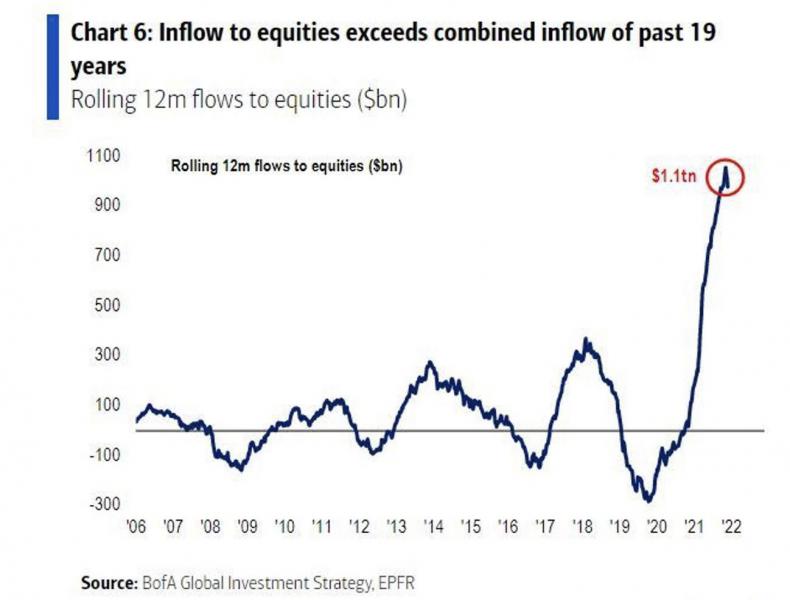 Powyższy wykres ciekawie komponuje się z analogicznymi danymi dotyczącymi globalnego rynku funduszy. Z wyliczeń BofA wynika, że napływy do funduszy akcji po okresie bezprecedensowego boomu zaczęły również zakręcać w dół.