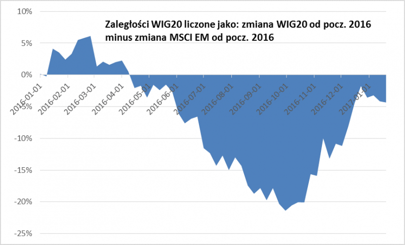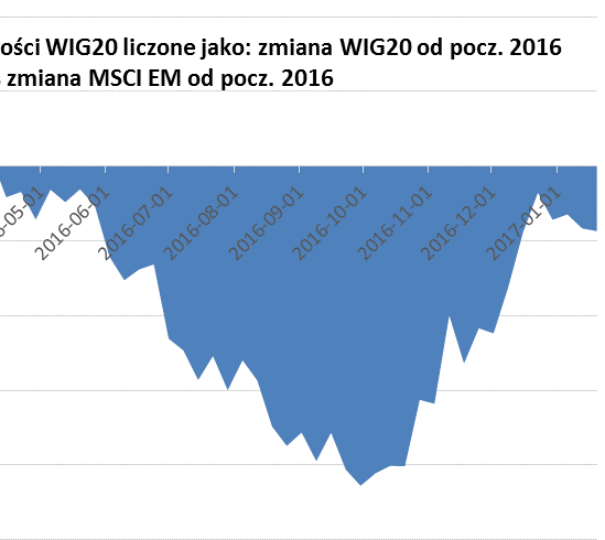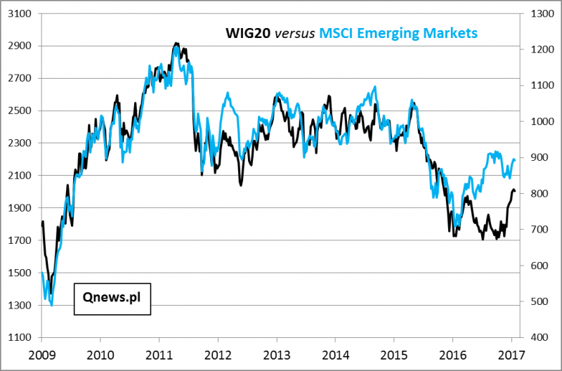 W ubiegłym roku kilkakrotnie wskazywaliśmy, że WIG20 zachowywał się dużo słabiej, niż indeks rynków wschodzących, z którym na dłuższą metę wiąże go silna więź (Polska najwyraźniej "wrzucana" jest do jednego koszyka z innymi emerging markets). Taką sytuację trudno było wytłumaczyć inaczej, niż jako skutek ryzyka politycznego po całej serii kontrowersyjnych pomysłów rodzimych decydentów. Ostatnio to się jednak mocno zmieniło.