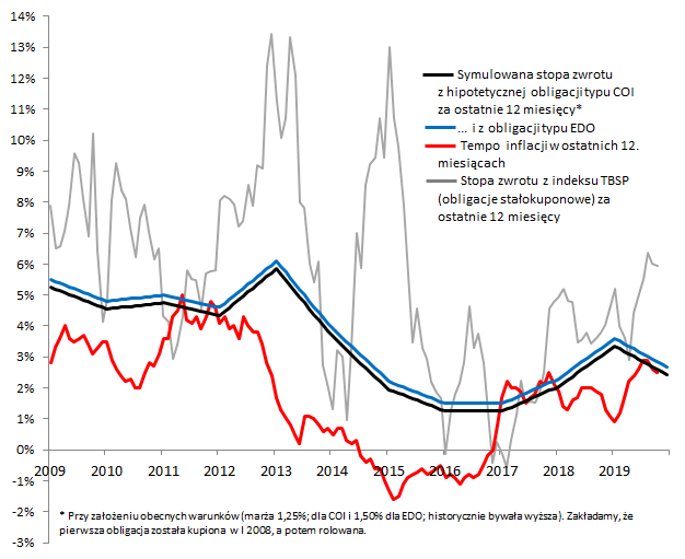Obecnie Skarb Państwa oferuje osiem serii obligacji detalicznych (skierowanych do osób fizycznych), z czego cztery są indeksowane inflacją. Z tych czterech dwie są publicznie dostępne (pozostałe dwie związane są z programem 500+): czteroletnie COI (cieszące się największym wzięciem) i dziesięcioletnie EDO. Ich konstrukcja jest podobna. W pierwszym rocznym okresie odsetkowym poziom oprocentowania jest stały (obecnie 2,4 proc. dla COI i 2,7 proc. dla EDO), w kolejnych – obliczany jako suma wskaźnika inflacji za ostatnie 12 miesięcy oraz marży (1,25 proc. w przypadku COI i 1,50 proc. dla EDO). Odsetki są kapitalizowane. Warto jeszcze dodać, że konstrukcja detalicznych papierów indeksowanych zdecydowanie różni się od sposobu budowy jedynej obecnej serii hurtowej (IZ0823), w przypadku której oprocentowanie jest stałe, natomiast poziom inflacji uwzględniony jest w indeksowanej wartości nominalnej, od której naliczane są odsetki.